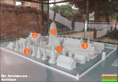 ทางเข้าวัดจะโมเดลแบบจำลองและแผนผังวัดราชบูรณะ รายละเอียดดังนี้ครับ